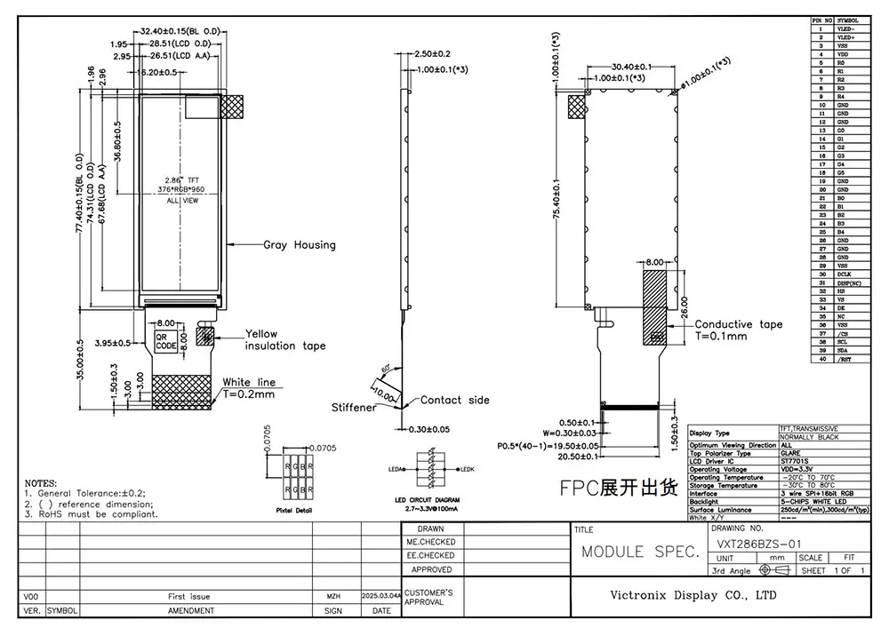 지능화 시대에 TFT 모듈을 사용하면 필요한 데이터를 시각적으로 표현할 수 있습니다. TFT 모듈의 품질은 애플리케이션에 중요한 영향을 미칩니다. Victronix 2.86인치 376×960 IPS TFT 모듈의 장점은 무엇입니까? 처음에는 300cd/m² 밝기, 1500:1 명암비, 전 방향 85도 시야각, 80% 균일성으로 생생한 이미지를 보장합니다. 둘째, ST7701S를 갖춘 SPI+16BIT RGB 인터페이스와 30,000~50,000시간의 수명을 가진 5-다이 백색 LED 백라이트를 지원하여 다양한 산업 애플리케이션에서 장기적인 사용성을 보장합니다. 또한 RoHS 표준을 준수하며 최대 8kV 공기 및 4kV 접촉에 대한 열 충격, 습도 및 ESD 보호를 포함한 엄격한 신뢰성 테스트를 성공적으로 통과했습니다. 이 제품은 -20°C ~ +70°C의 극한 온도에서 효율적으로 작동하며 -30°C ~ +80°C의 가혹한 보관 조건을 견딜 수 있습니다.
